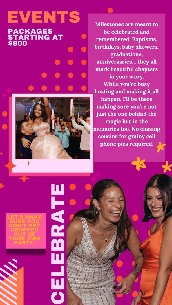 From birthday parties and baby showers to intimate gatherings and milestones, I document your event as it unfolds, so you don’t miss it while trying to capture it. You get to be in the moment, and I’ll make sure you’re in the memories too.