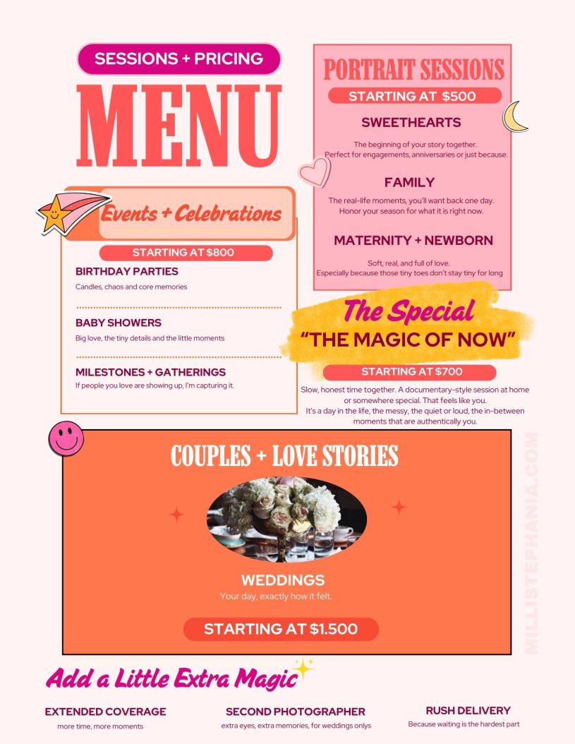 Pricing is listed with starting rates, and each session offers three package choices for flexibility, whether you’re keeping it simple or want the full storytelling experience.